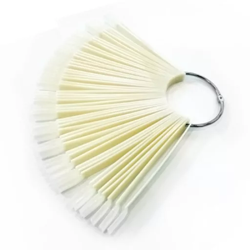 Bemutató, díszítő tip készlet, natural, a díszítési technikák, különböző lakk minták bemutatására alkalmas tip készlet, natur, nem áttetsző változatban. A csomag 50db tip pálcikát és egy fém karikát tartalmaz.