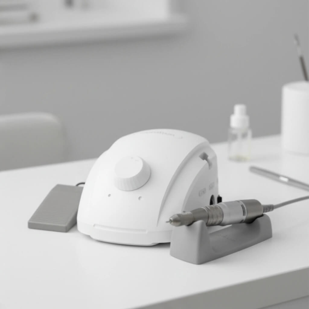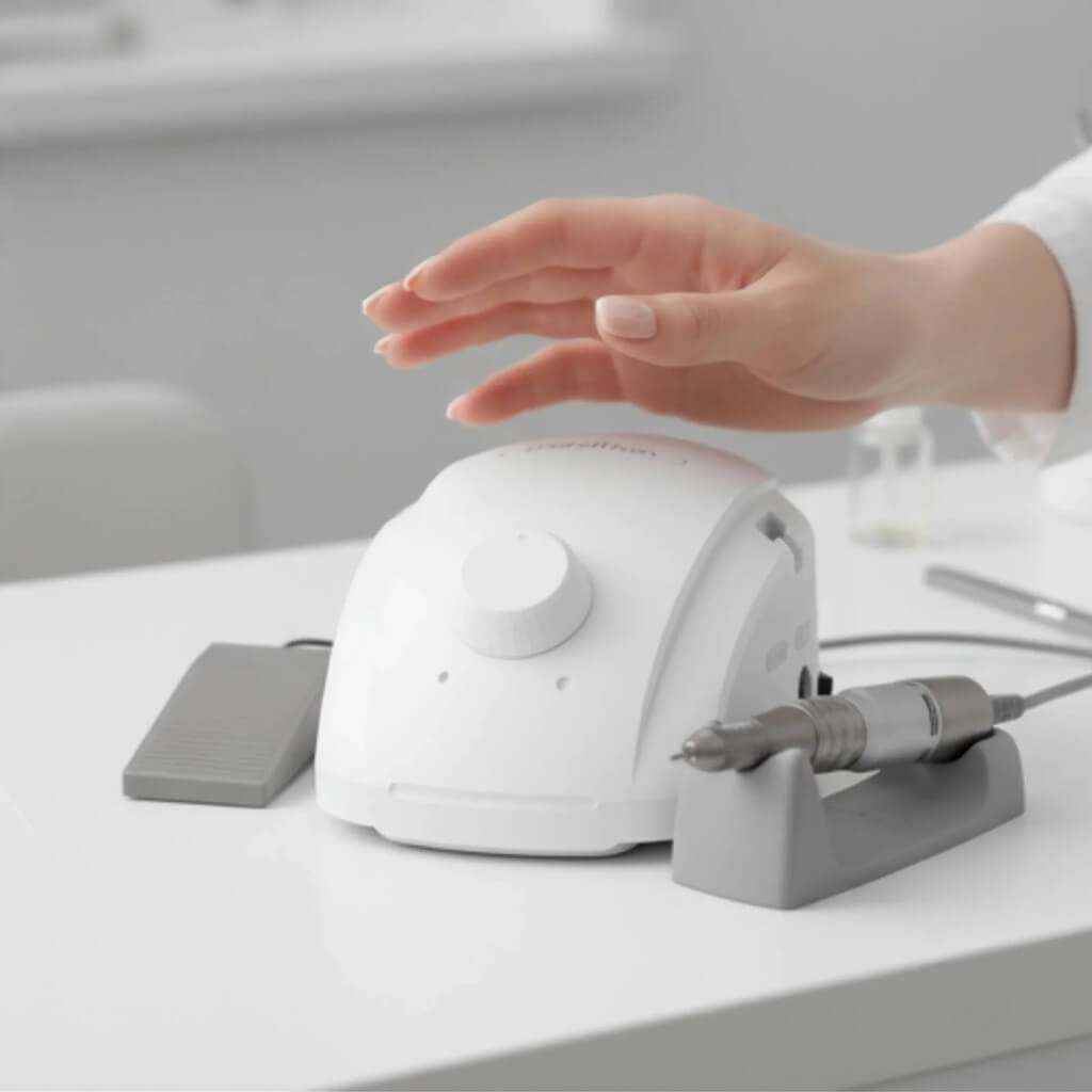 A lábpedál lehetővé teszi a körömcsiszoló gép vezérlését anélkül, hogy el kellene venned a kezed a munkától. Be- és kikapcsolhatod, sőt a fordulatszámot is szabályozhatod vele, különösen aprólékos, precíziót igénylő munkáknál rendkívül hasznos funkció.